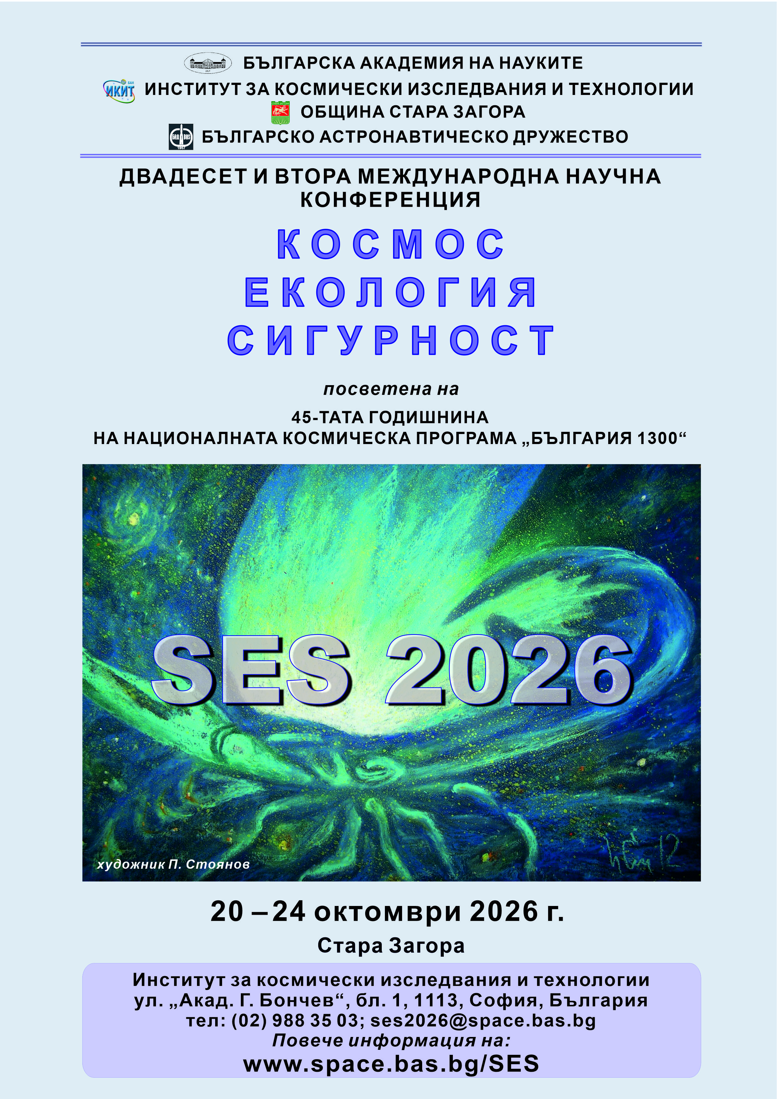 От 20 до 24 октомври 2026 г. ще се проведе поредната Двадесет и втора международна научна конференция Космос, Екология, Сигурност (Space, Ecology, Safety) – SES 2026 Посветена на 45-тата годишнина на националната космическа програма "БЪЛГАРИЯ 1300" Организатори: